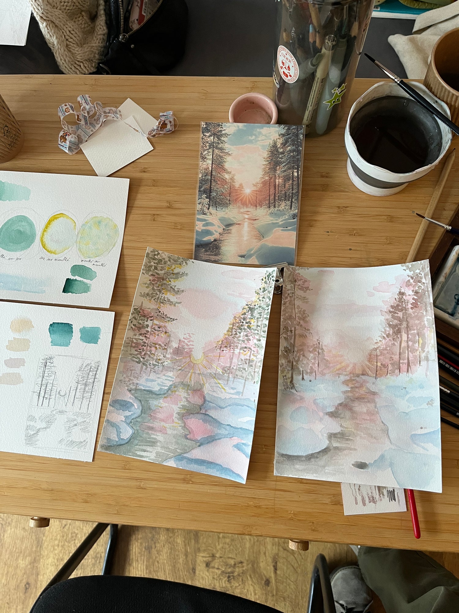 Paysage d'hiver au pastel et à l'aquarelle